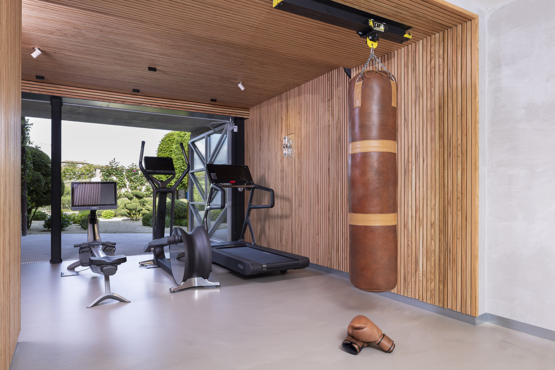 At Paragon Studio, we’ve seen this trend flourish in home gym designs, where large sliding doors or glass walls allow for seamless transitions between workout areas and outdoor spaces. There’s nothing quite like exercising with a view of nature. Whether it’s through small touches like adding more greenery or larger architectural changes, biophilic design is a trend that’s here to stay.